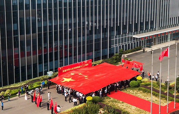 此次活動(dòng)最后環(huán)節(jié)是傳遞巨幅國旗。每位四藥員工,用自己的手掌托起國旗,讓掌心去感受這一刻最熾熱的愛國情誼。伴隨著高昂的合唱聲,本次的活動(dòng)走向了高潮。這次的升旗儀式,充滿了溫情,最大程度的激發(fā)了全體四藥員工的愛國熱情。四藥人不忘初心,必將披荊斬棘,銳意進(jìn)取,不斷創(chuàng)新,再創(chuàng)佳績,再鑄輝煌!